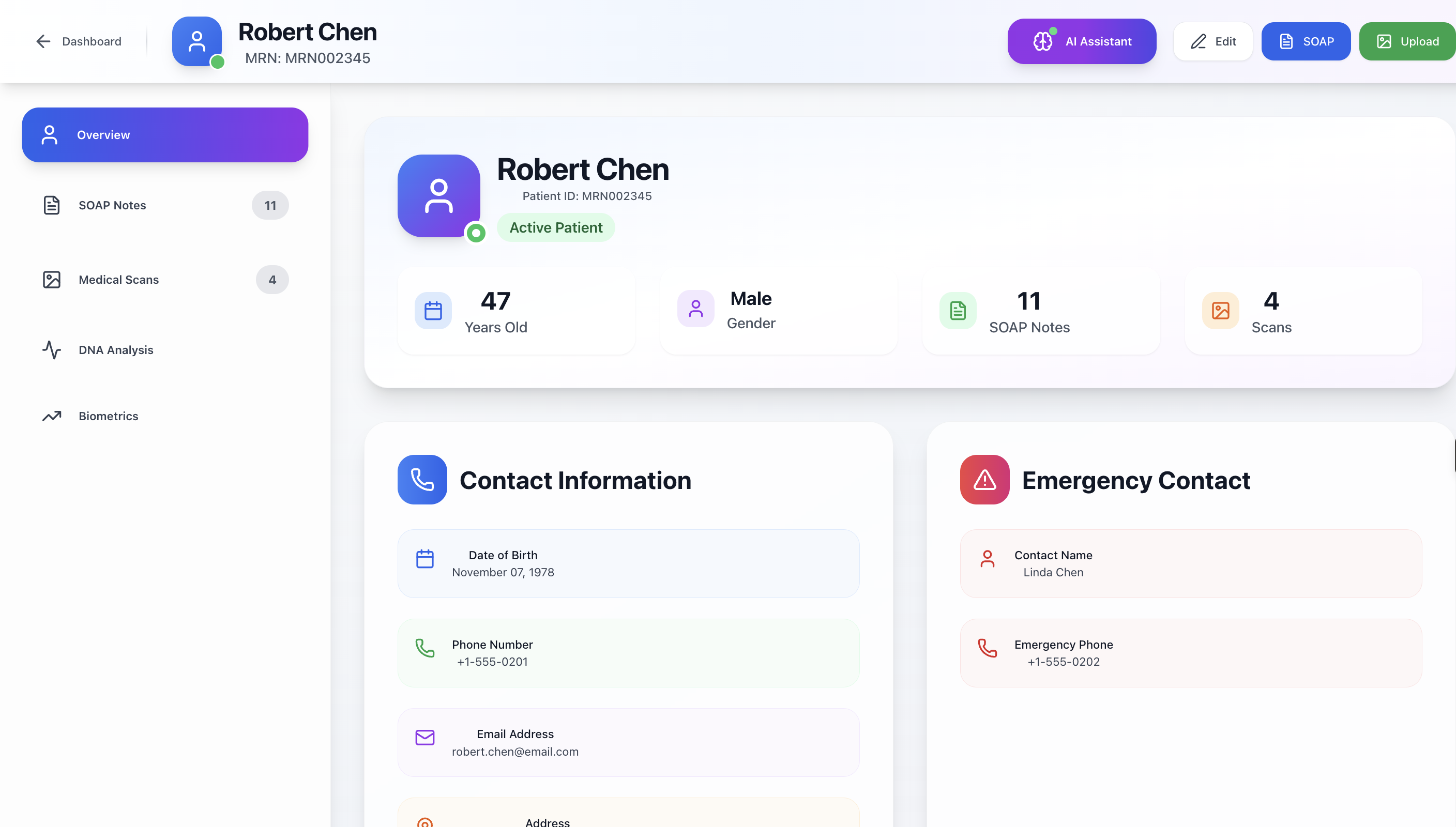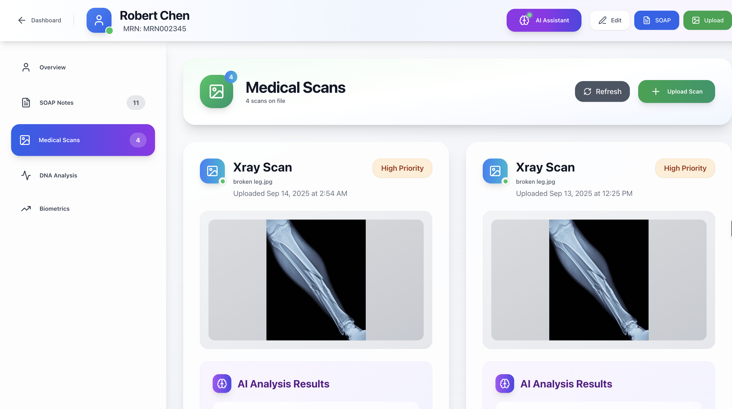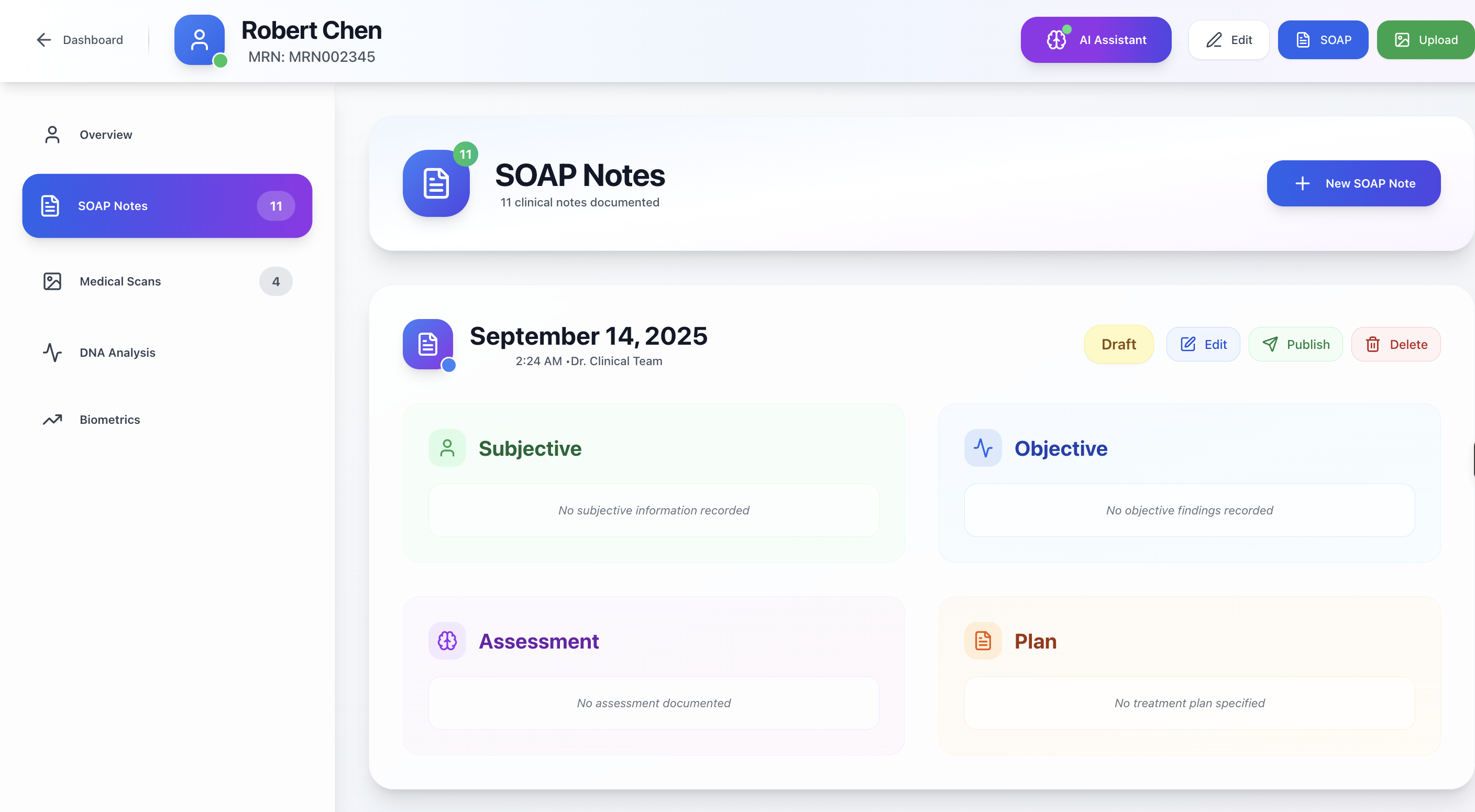 The platform addresses critical pain points in modern healthcare by automating routine tasks, providing AI-powered diagnostic suggestions, and enabling seamless voice-to-text clinical documentation. Healthcare providers can manage patient records, create SOAP notes, analyze medical scans, and access real-time diagnostic assistance all within a single, elegant user interface.
